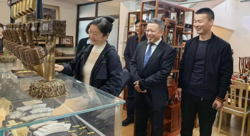 汉绣传承人任炜则带着大家领略四大类绣品的精妙,她展开一件双面绣作品介绍:“我们的白描底稿不标针法和配色,绣娘能凭自己的理解自由发挥;现在我们也做了很多贴合现代生活的绣品,越来越多年轻人主动来拜师学艺。”从庄重的宗教法衣到实用的居家饰品,传统针法与现代审美巧妙融合,尽显非遗传承的灵活性与生命力。参观中,大家围绕“科技如何助力非遗传播”展开热议,共同探讨数字化手段在技艺记录、文创开发中的创新应用路径。