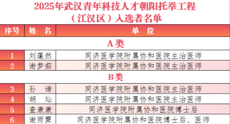 近日,根据《武汉青年科技人才朝阳托举工程实施办法(试行)》规定,经专家评审、市科协党组审定、社会公示,确定2025年武汉青年科技人才朝阳托举工程A类入选者14名、B类入选者21名,全市35名优秀科技青年才俊入选首届朝阳托举工程,其中江汉区刘蓬然、谢梦茹、孙谛、胡灿、查康康、谢雨霁等6名青年人才成功入选,平均年龄31岁,占入选总数的六分之一,还是入选类别在全市独占鳌头,首屈一指!