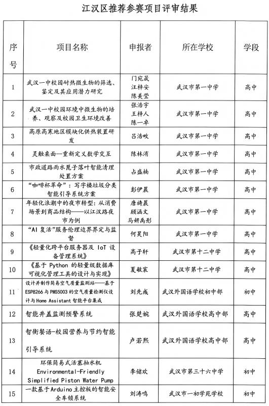 根据《市科协等4部门关于举办第40届武汉市青少年科技创新大赛的通知》相关精神,江汉区各有关单位积极开展申报、推荐、评审工作。现将评审结果予以公示,公示期为:2026年1月23日—2026年1月27日。任何单位和个人对评审结果持有异议,请在公示时间内以书面形式向区科协反映。反映情况须客观真实,以单位名义反映情况的材料需加盖单位公章,以个人名义反映情况的材料应署实名并提供有效身份证明。
