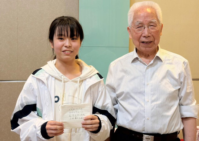高一(4)班的赵古悦听完讲座心潮澎湃,当场提笔写下一首藏头诗,以诗抒怀,致敬航天前辈。“龙头扬志气高昂,乐终生伟业八方。豪情流淌引新航,点燃薪火后路长。”在休息室内,她将这首饱含敬意的小诗轻声念给龙乐豪总师听,声音还带着几分紧张的颤抖。龙乐豪亲切地安抚了她,并感谢她的创作,勉励她珍惜时光、勤学奋进。