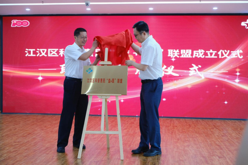 市科协党组成员、副主席张若光,区委副书记、政法委书记陈红山为江汉区科普惠民“益+医”联盟揭牌